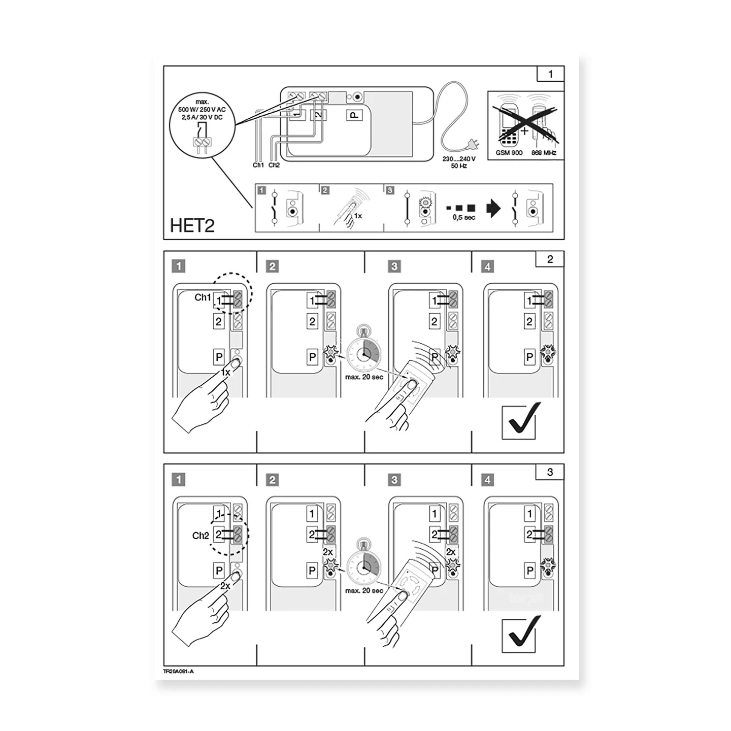 Mit dem Set, bestehend aus dem Hörmann 2-Kanal-Relais-Empfänger HET 2, 868 MHz und den beiden Hörmann Handsender HSM 4, 868 MHz, kann Ihr Antrieb kostengünstig auf den Hörmann-Funkstandard 868 MHz Festcode umgerüstet werden. Insgesamt sind bis zu zwei Antriebe bzw. Geräte an den Empfänger anschließbar. Der Empfänger ist in einem separaten Gehäuse aus Kunststoff untergebracht und verfügt über eine einen Meter lange Anschlussleitung mit Eurostecker. Über die zwei Hörmann Handsender HSM4 lässt sich der Empfänger HET2 ideal bedienen.