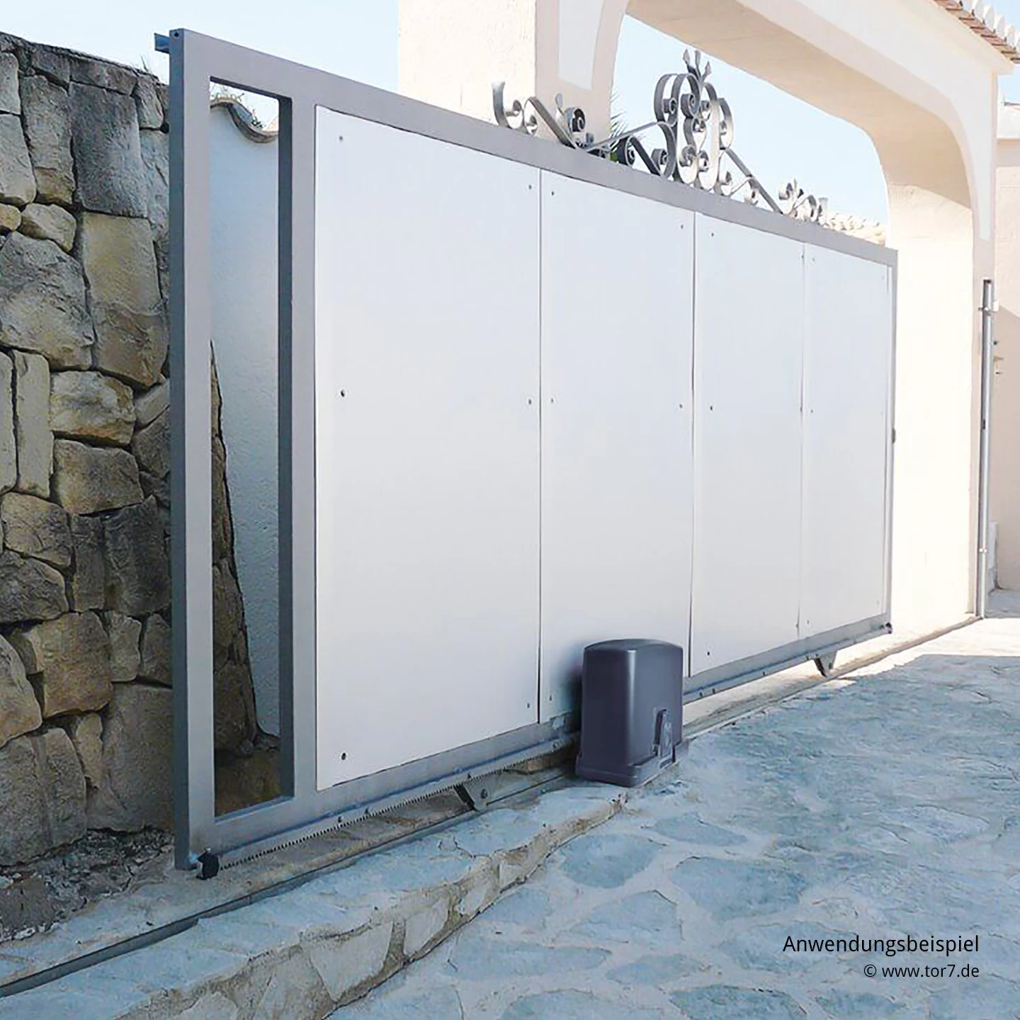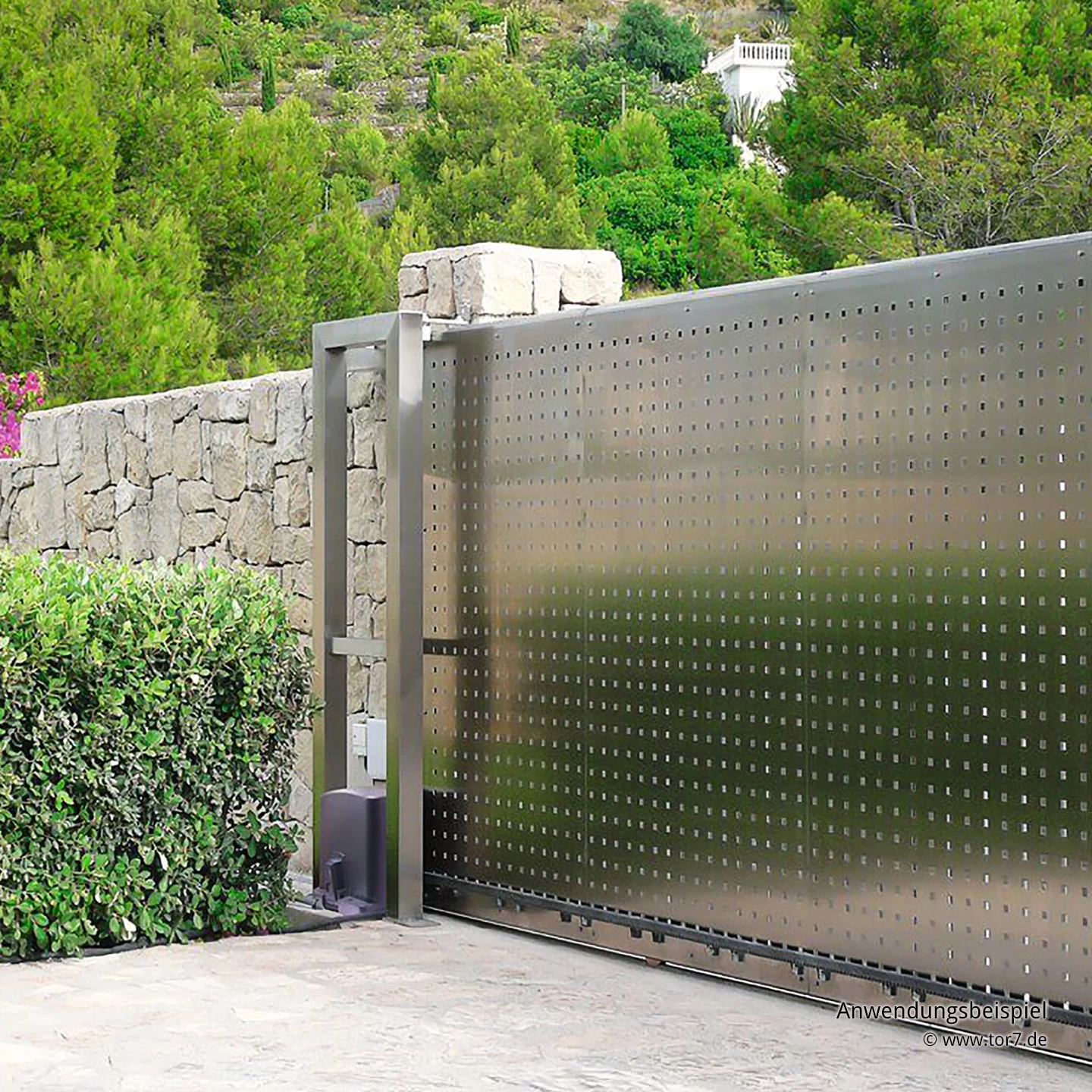 Gerade bei größeren Toren ist es einfacher, diese mit einem Torantrieb zu betreiben, als ohne. So bräuchten Sie den schweren Torflügel nicht mehr mühselig von Hand bewegen, wenn stattdessen ein Tastendruck auf den zugehörigen Handsender ausreicht. Der Antrieb würde den Rest der Arbeit übernehmen und das Tor von ganz allein auffahren. Passend für größere Tore wird hier der SOMMER Schiebetorantrieb RUNner Plus angeboten. Dieses Antriebsmodell lässt sich sowohl an freitragenden als auch an bodengeführten Schiebetoranlagen installieren. Hierbei ist ein maximaler Torlaufweg von 12000 mm und ein Torgewicht von bis zu 800 kg zugelassen, allerdings müssen ab 600 kg Stahlzahnstangen verwendet werden.
