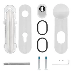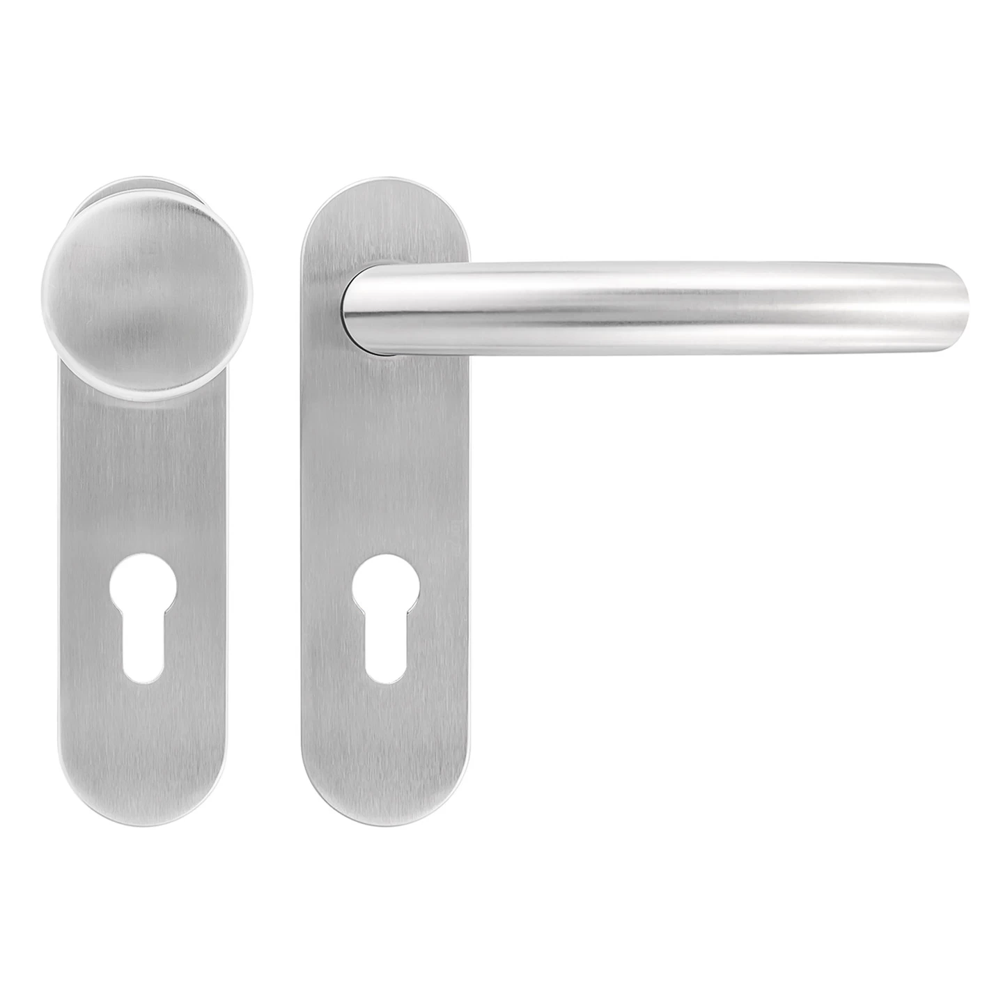 Das wartungsfreie Gleitlager aus selbstschmierenden Kunststoff ist festdrehbar gelagert und sorgt so auch bei starkem Nutzungsaufkommen für einen gleichbleibend hohen Bedienkomfort. Durch die stabile Stahlunterkonstruktion mit Stütznocken und die durchgehende Verschraubung sitzt die Garnitur dauerhaft sicher und stabil. Auch das exklusive und ansprechende Design überzeugt. Der Drücker ist im Typ 510 gefertigt und der Außendrücker als Knopf K-130. Kurzschild und Garnitur bestehen aus hochwertigem, rostfreiem Edelstahl 1.4301 und sind matt gebürstet. Die Montage ist dabei ohne großen Zeit- und Arbeitsaufwand erfolgt. Allen notwendigen Montageteile liegen der Wechselgarnitur bei.